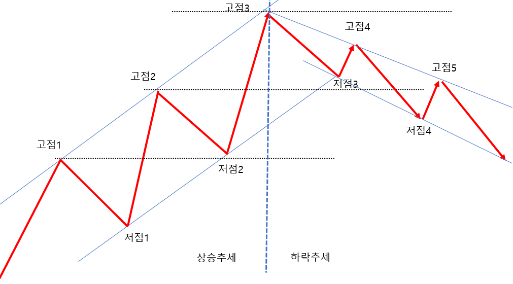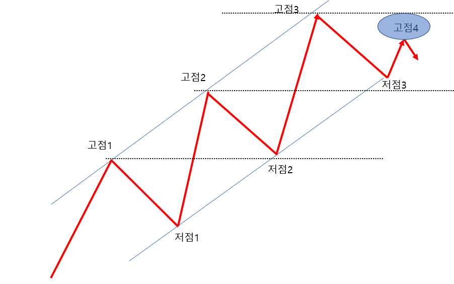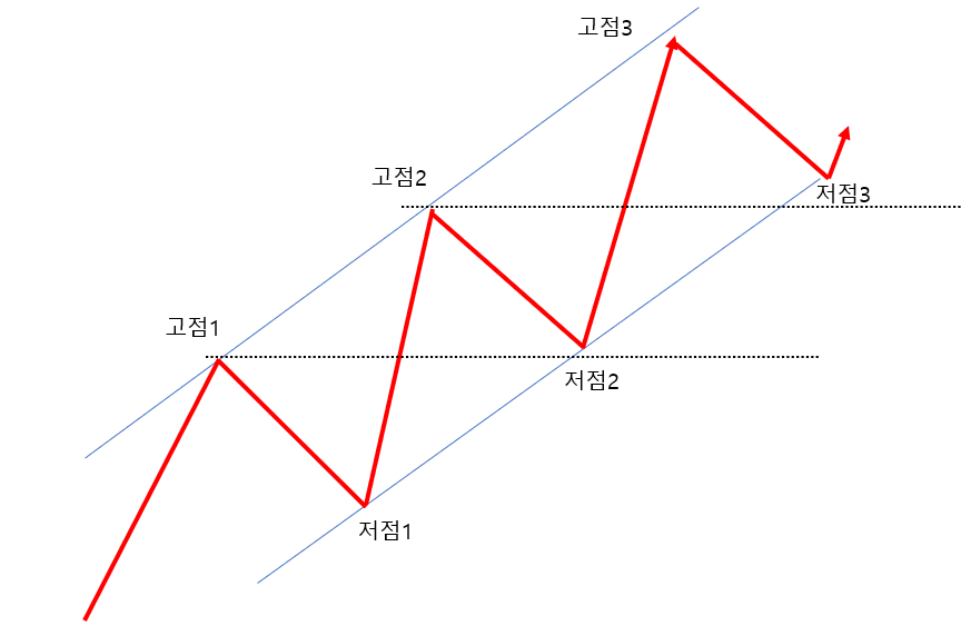 상승추세에서는 고점1<고점2<고점3, 저점1<저점2