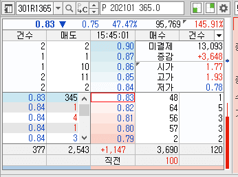 예를들어 예전 코스피200 1월물(둘째주 만기) 현지수 -5%에 해당하는 풋옵션의 가격입니다. (호가창은 25만원 곱해서 보면된다. 0.83*25만=20.75)