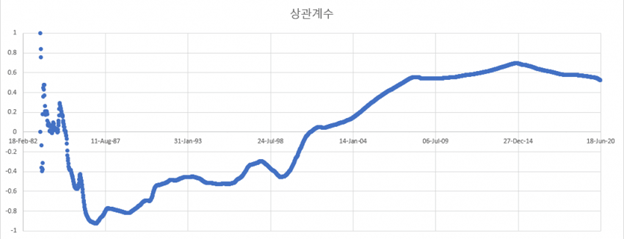 (위 통계는 investing.com데이터를 통해 직접 산출한 것으로 80년대부터 해당날짜까지의 데이터 집합간의 상관관계를 산출)