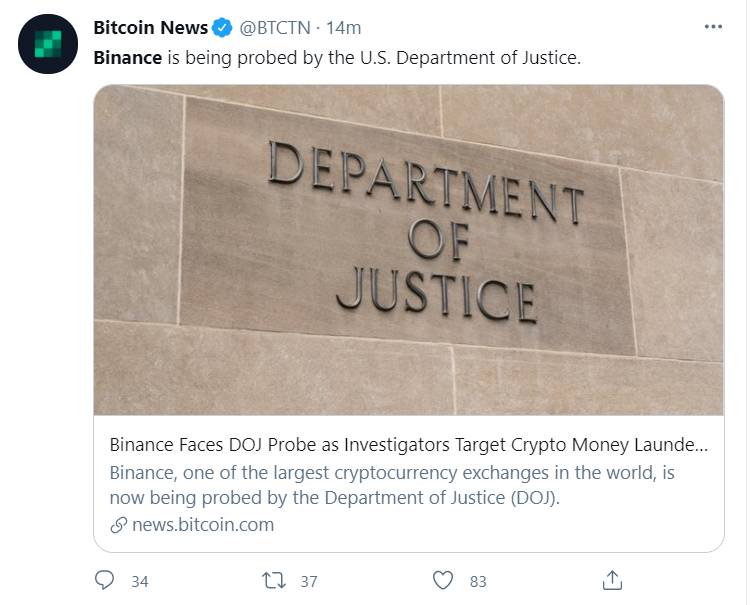 세계 최대 암호화폐 거래소 바이낸스(Binance)가 미국 법무부와 국세청(IRS)의 조사를 받고 있다는 블룸버그의 보도가 나왔습니다.