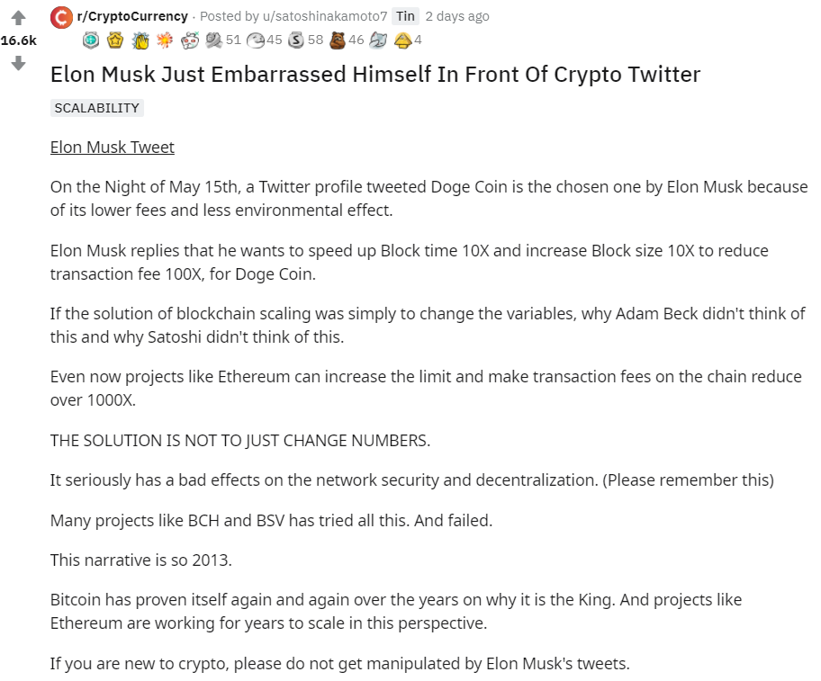 암호화폐 커뮤니티 크리토커런시(r/CryptoCurrency)에서도 일론 머스크가 암호화폐의 본질을 전혀 모른다며 그의 언행으로 코인시장을 조작이 가능하는것을 분개하였습니다. 또한 그를 조용히시킬 방법을 모색해야한다고 했습니다.