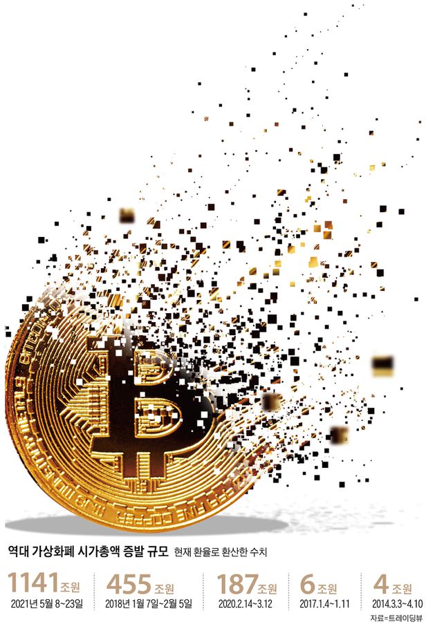 전 세계 가상 화폐 시가총액이 지난 2주 동안 1200조원 넘게 증발한 것으로 집계됐습니다. 중국, 미국 등 각국 정부가 규제 대책을 발표하고, 유럽중앙은행(ECB) 등이 가상 화폐 거품 우려를 내놓고, 테슬라의 비트코인 결제 중단 등이 이어진 데다 전문가들의 가상 화폐 시장 과열 경고가 꼬리를 물면서 단기간에 악재가 쏟아졌기 때문인데요. 23일 가상 화폐 정보 사이트 트레이딩뷰에 따르면, 이날 오후 6시 기준 전 세계 가상 화폐 시장 시가총액은 1조3960억달러(약 1573조원)로 역대 최고점을 찍었던 5월 8일(2714조원)보다 1141조원(42%) 줄었습니다.