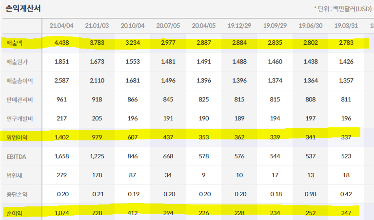 손익계산서를 보면 왼쪽으로 올수록 매출액이 늘고 있고 영업이익과 순이익도 늘고 있다. 원래 수익과 이익이 늘면 원가, 판관비, R&D 비용도 늘어나므로 그런 것들은 크게 신경쓰지 않아도 된다.