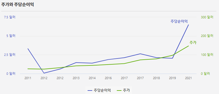 (2) 재무재표를 훓어봤으면 어닝을 살펴본다. 아래와 같이 그래프를 통해 간단하게 확인해도 되지만 시간이 허락한다면 몇 년치 EPS를 구해서 EPS Growth를 계산하는 것을 추천한다. 회사의 성장 추세를 가장 직관적으로 파악할 수 있기 때문이다.