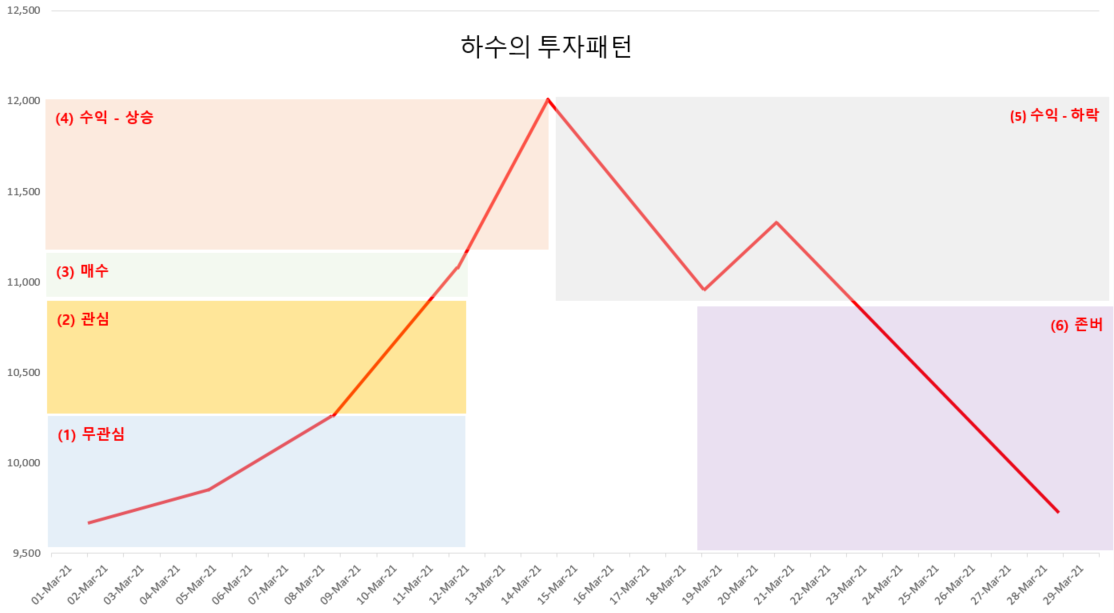 (5) 수익 - 하락: 주가가 꺽였지만 여전히 수익구간이다. 이미 가치투자, 장기투자를 표명했고 아직은 매입가보다 주가가 높은 수준이니 참을성있게 기다리겠다고 다짐한다. 제대로된 조정기나 하락기를 겪어본 경험도 없으면서 이런 조정(하락)이 오히려 기회라고 하면서 불량주에 물타기를 하기도 한다.