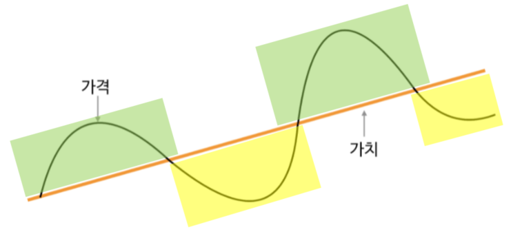 언뜻 보기에는 가격이 가치에 비해 낮은 노란색 구간에 매수하고 가격이 가치에 비해 높은 초록색 구간에 매도하는 것을 간단하게 설명하는 것 같다. 그러나, 이 그림 역시 투자의 기본처럼 그냥 한번 보고 스치듯 지나가면 아무 소용이 없다.