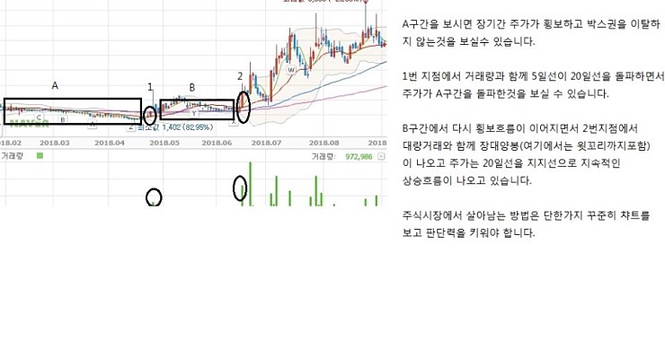 2. 횡보하던 주가가 거래량이 실리면서 장대양봉을 만들때입니다.