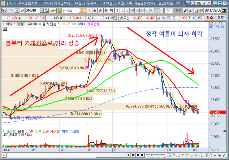 정작 여름으로 접어들자 선도세력이 차익실현을 하면서 주가가 하락을 하였다는것을 확인할 수 있다.